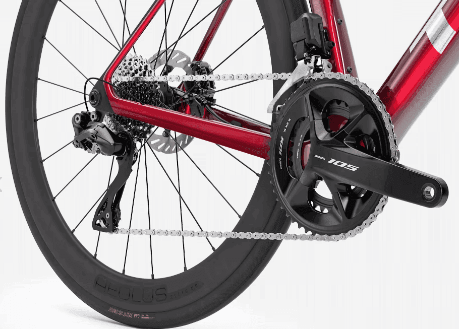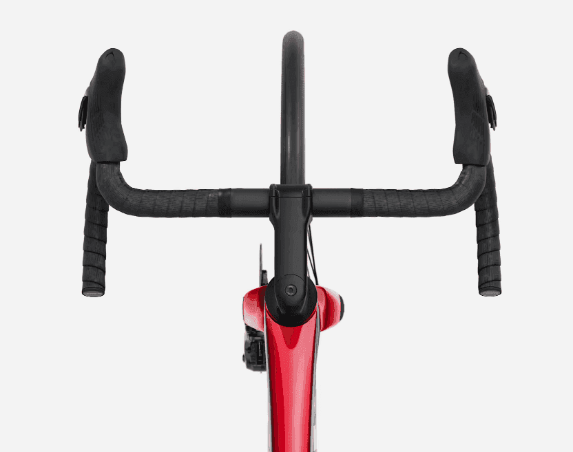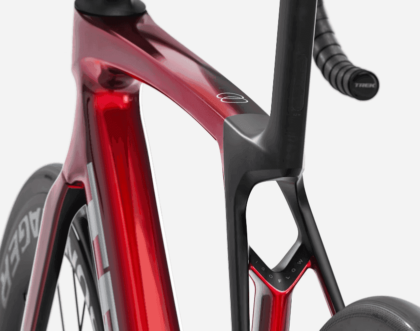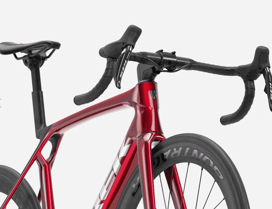 Forcella: Madone Gen 8 full carbon, cannotto conico in carbonio, passaggio freni interno, disco flat mount, perno passante smussato 12x100mm